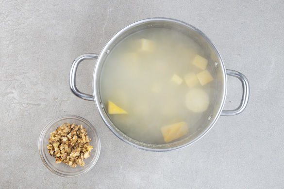 Den Backofen auf 160°C Umluft (180°C Ober-/Unterhitze) vorheizen. Die Steckrübe und die Petersilienwurzeln schälen, in 2–3cm große Stücke schneiden und in einem mittelgroßen Topf mit leicht gesalzenem Wasser bedeckt aufkochen. In 15–20Min. weich kochen. Die Walnüsse grob hacken und in einer großen Pfanne ohne Fett bei mittlerer Hitze 2–3Min. anrösten. Herausnehmen und beiseitestellen.