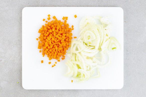 Die Karotte schälen und in möglichst kleine Würfel schneiden. Den Fenchel längs halbieren, den Strunk herausschneiden und den Fenchel in dünne Streifen schneiden.