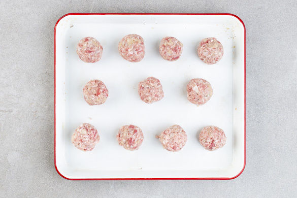 Die Salsiccia von der Pelle befreien und mit dem Schweinehackfleisch, den Semmelbröseln, der 1/2 der Zwiebeln, der 1/2 des Knoblauchs sowie Salz und Pfeffer gut verkneten. Ca. 10–12 kleine Hackbällchen formen, in eine Auflaufform geben und 12–15Min. im Ofen backen, bis die Hackbällchen gar sind.