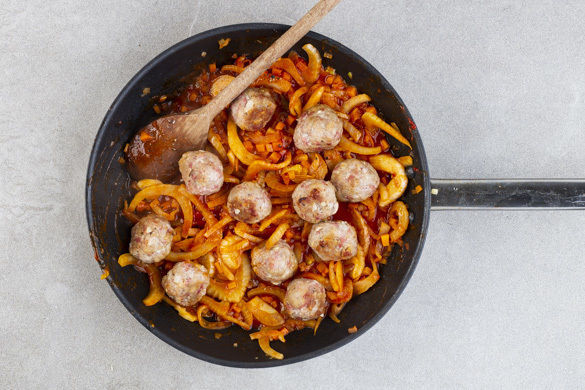 Die restlichen Zwiebeln, den restlichen Knoblauch, die Karotten und den Fenchel in einer mittelgroßen Pfanne mit 1–2EL Olivenöl bei mittlerer Hitze 3–4Min. anbraten. Das Tomatenmark unterrühren und mit 200ml Wasser ablöschen. Die Sauce aufkochen und 4–5Min. köcheln lassen, dann die Hackbällchen samt Bratensaft dazugeben. Mit 1EL Butter sowie Salz und Pfeffer verfeinern.