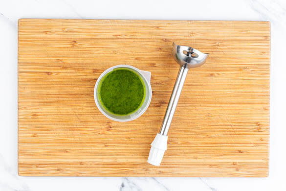 Den Backofen mit Grillfunktion oder Ober-/Unterhitze auf 250°C vorheizen. Die Petersilie und den Schnittlauch grob schneiden. Die Zitrone halbieren und auspressen. Die Kräuter, 1EL Zitronensaft, 4EL Olivenöl sowie je 1 kräftige Prise Salz und Pfeffer in ein hohes Gefäß geben und fein pürieren. Ggf. mit mehr Salz und Pfeffer abschmecken. Den Stabmixer abspülen.