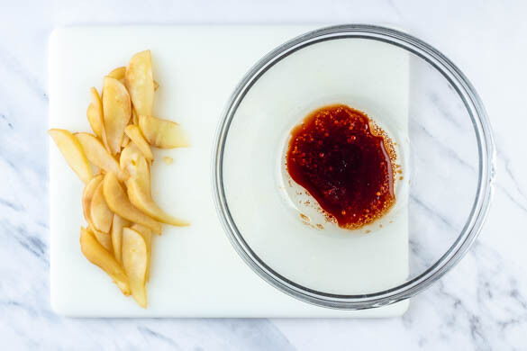 Am Tag der Veranstaltung die Pochierflüssigkeit ohne die Birnen in einem kleinen Topf mit ¼TL Brühgewürz bei mittlerer Hitze erwärmen und die Flüssigkeit um 75% einkochen lassen. Dann die Hitze auf niedrige Stufe reduzieren und 1TL kalte Butter einrühren, um eine glänzende Textur zu erhalten. Ggf. mit mehr Brühgewürz abschmecken.
