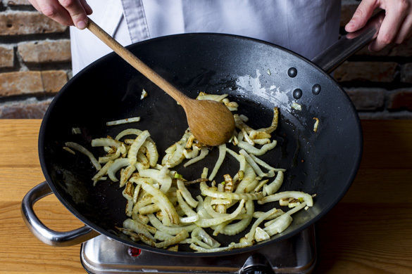 Den Fenchel in einer großen Pfanne mit 1EL Olivenöl bei mittlerer Hitze 5–7Min. anbraten, bis er goldbraun und weich ist.