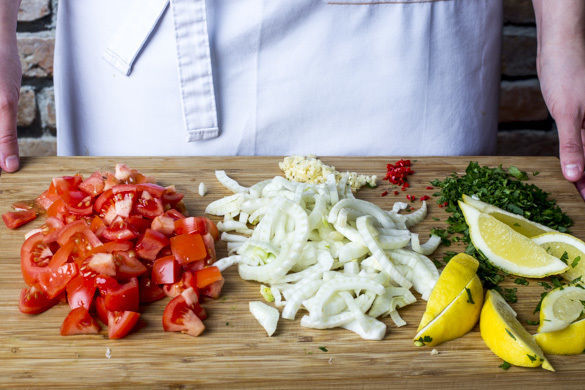 Die Tomaten in 1–2cm große Stücke schneiden. Den Fenchel halbieren und in feine Streifen schneiden, dabei den Strunk entfernen. Die Petersilienblätter abzupfen und fein hacken. Die Zitrone in Spalten schneiden. Die Chilischote längs halbieren, entkernen und in feine Streifen schneiden. Den Knoblauch schälen und fein würfeln.