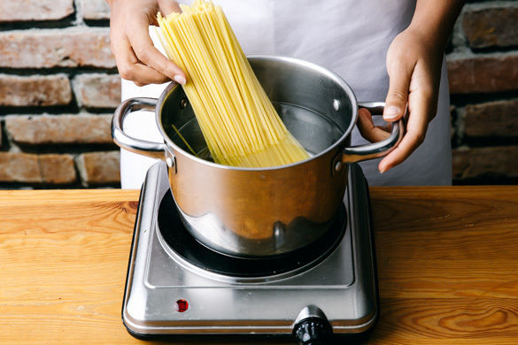 In einem mittelgroßen Topf ausreichend gesalzenes Wasser für die Pasta zum Kochen bringen. Die Pasta in das kochende Wasser geben und in 7–9Min. bissfest kochen. In ein Sieb abgießen und abtropfen lassen.