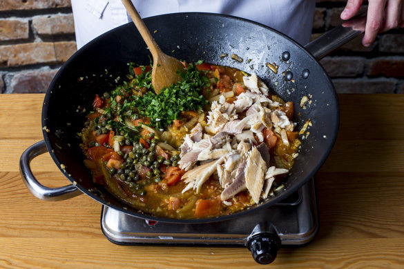 Den Fisch in mundgerechte Stücke zupfen, Haut und Gräten entfernen. Die 1/2 der Fischstücke, die 1/2 der Kapern oder mehr und die 1/2 der Petersilie unter die Sauce rühren, dann die Pasta und ggf. mehr Brühe hinzufügen. Die Pasta auf Teller verteilen, mit dem restlichen Fisch und der restlichen Petersilie garnieren und mit den Zitronenspalten servieren.