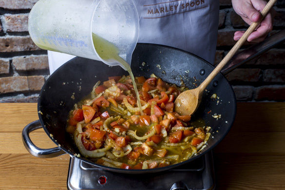 Die Tomaten, die 1/2 der Chili oder mehr nach Geschmack und den Knoblauch dazugeben und 2Min. mitbraten, bis der Tomatensaft austritt. Die 1/2 der Brühe angießen und die Sauce ca. 3Min. köcheln lassen. Mit Salz und Pfeffer abschmecken.
