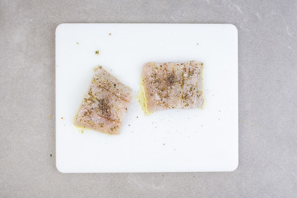 Den Fisch in 2 gleich große Stücke schneiden. Vorsicht, der Fisch kann Gräten enthalten. Diese am besten jetzt mit einer Pinzette entfernen oder später beim Essen darauf achten. Die 1/2 der Provencekräuter mit 1–2EL Olivenöl verrühren und den Fisch mit dem Gewürzöl sowie Salz und Pfeffer einreiben.