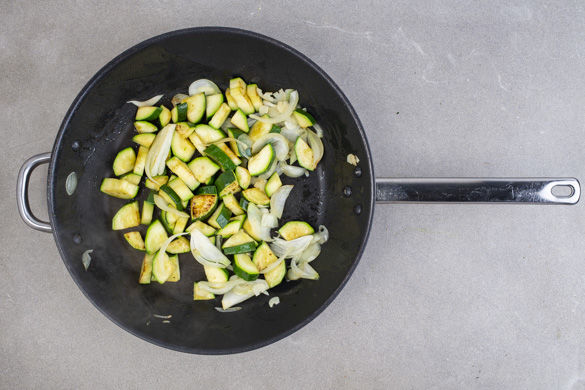 Die Zucchini in einer großen Pfanne mit 1–2EL Olivenöl bei starker Hitze ca. 2Min. anbraten.