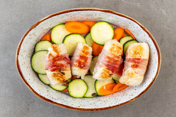 Die Involtini mit je 1 Prise Salz und Pfeffer würzen und in einer großen Pfanne mit 2EL Olivenöl bei mittlerer Hitze rundum 2–3Min. anbraten. Die Karotten, die Zucchini und den Knoblauch in einer Auflaufform verteilen, die Involtini auf das Gemüse legen und alles 8–10Min. im Ofen backen, bis das Fleisch gar ist.