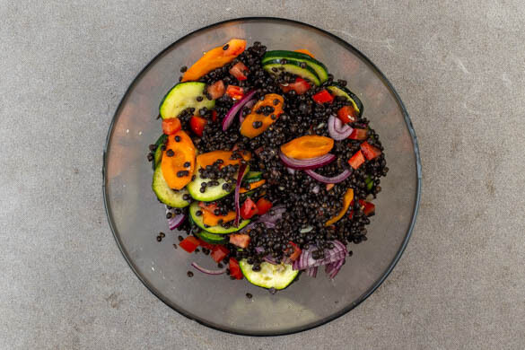 Den Backofen auf 200°C (180°C Umluft) vorheizen. In einem großen Topf 1L Wasser mit dem Brühgewürz aufkochen. Die Linsen in das kochende Wasser geben, erneut aufkochen lassen und anschließend abgedeckt bei mittlerer bis niedriger Hitze 18–20Min. sanft köcheln lassen, bis die Linsen gar sind. In ein Sieb abgießen.