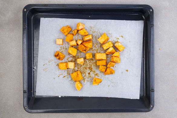 Den Backofen auf 180°C Umluft (200°C Ober-/Unterhitze) vorheizen. Die Süßkartoffel schälen und in ca. 2cm große Würfel schneiden. Die Süßkartoffelwürfel auf ein mit Backpapier ausgelegtes Backblech geben, mit 1–2EL Pflanzenöl, Salz nach Geschmack und ca. 1TL Gewürzmischung vermengen und ca. 20Min. im Ofen backen.