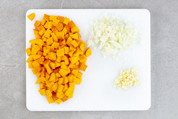 In einem mittelgroßen Topf ausreichend gesalzenes Wasser für die Pasta zum Kochen bringen. Den Kürbis halbieren, mit einem Löffel entkernen und in ca. 1cm große Würfel schneiden. Die Zwiebel schälen und in feine Würfel schneiden. Den Knoblauch schälen und ebenfalls fein würfeln.