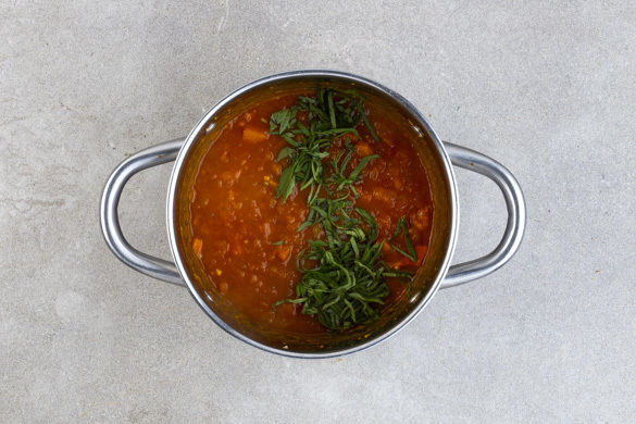 Den Kürbis in einem weiteren mittelgroßen Topf mit 1–2EL Olivenöl bei mittlerer Hitze 2–3Min. anbraten. Die Zwiebeln und die 1/2 des Knoblauchs dazugeben und 1–2Min. mitbraten. Das Brühgewürz in 300ml heißem Wasser auflösen.