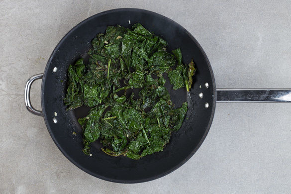 Die Zitrone halbieren und auspressen. Den Schwarzkohl in grobe Stücke zupfen, dabei den harten Strunk entfernen. Den Schwarzkohl mit dem restlichen Knoblauch, 1–2EL Zitronensaft, 1–2EL Olivenöl und 1 Prise Salz vermengen und 1–2Min. ziehen lassen. Wer mag, kann mehr Zitronensaft nehmen. Den Kohl in einer großen Pfanne bei mittlerer Hitze 4–5Min. knusprig anbraten.