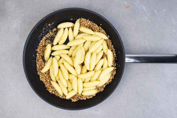 In einer großen Pfanne 2–3EL Butter schmelzen und die Nüsse sowie die Semmelbrösel darin 1–2Min. anrösten.