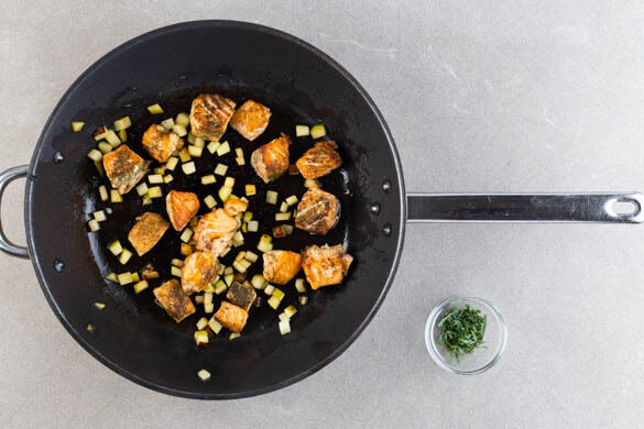 Den Fisch mit kaltem Wasser abspülen und trocken tupfen. Mit einem scharfen Messer die Haut vorsichtig abziehen und evtl. vorhandene Gräten entfernen, dann den Fisch in 1–2cm große Würfel schneiden und mit der Gewürzmischung einreiben.