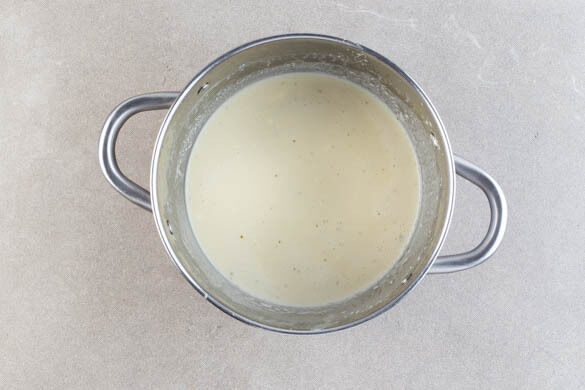 Die Zwiebeln und den Knoblauch in einem großen Topf mit 2EL Butter bei mittlerer Hitze ca. 1Min. anschwitzen. Mit 1L Wasser ablöschen, das Brühgewürz unterrühren und die Suppe 3–4Min. sanft köcheln lassen. Dann die Crème fraîche unterrühren und die Suppe mit einem Stabmixer pürieren.