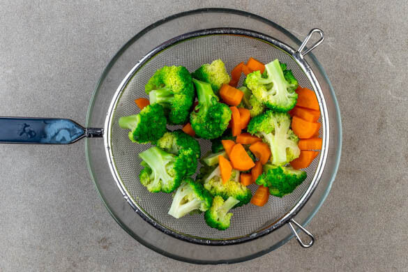 In einem großen Topf leicht gesalzenes Wasser zum Kochen bringen. Inzwischen den Brokkoli in ca. 4cm große Röschen schneiden. Die Karotten ggf. schälen, längs halbieren und schräg in ca. 0,5cm dünne Scheiben schneiden. Den Brokkoli und die Karotten in das kochende Wasser geben und ca. 5 Min. blanchieren. In einem Sieb abtropfen lassen und gut mit kaltem Wasser abspülen.