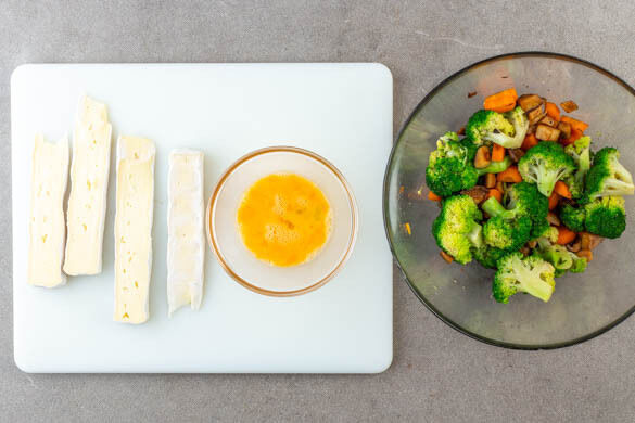 Den Brokkoli und die Karotten mit den Pilzen vermengen, dann 2TL Honig unterrühren und gut mit Pfeffer würzen. Das Gemüse im Gefrierschrank 10–15Min. abkühlen lassen, bis es kalt genug ist, um es zu handhaben. Inzwischen den Käse jeweils in 4 Streifen schneiden. 1 Ei mit einer Gabel verquirlen.