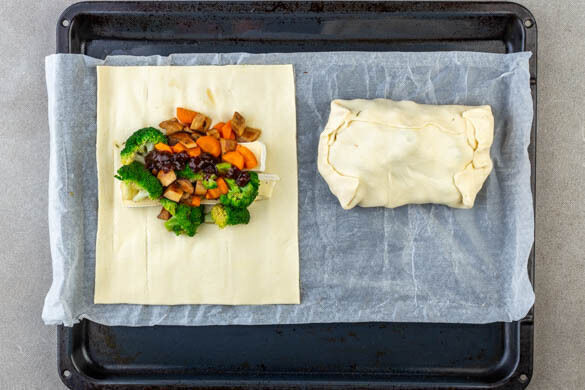 1 Teig mit dem Papier nach unten auf einem Backblech ausrollen und quer halbieren. Je 2 Käsestreifen in die Mitte der Teighälften legen, dann jeweils ¼ der Gemüsemischung und ¼ des Chutneys darauf verteilen. Die Teigränder über der Füllung zusammenklappen und verschließen. In den Kühlschrank stellen und den Vorgang mit den übrigen Pastetenzutaten wiederholen.