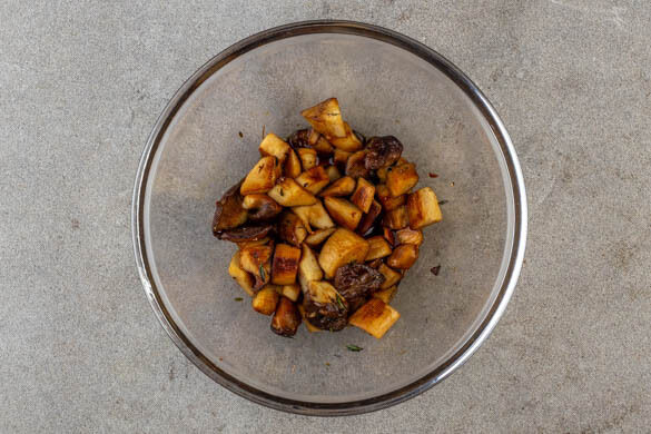 Den Backofen auf 240°C (220°C Umluft) vorheizen. Die Pilze grob würfeln und mit ¼ des Thymians in einer mittelgroßen Pfanne mit 1EL Olivenöl bei mittlerer Hitze leicht bräunlich anbraten. Mit 1 Prise Pfeffer würzen und unter gelegentlichem Rühren 8–10Min. braten. Die Thymianzweige entfernen und die Pilze mit der ½ der Sojasauce vermengen. Im Kühlschrank aufbewahren.