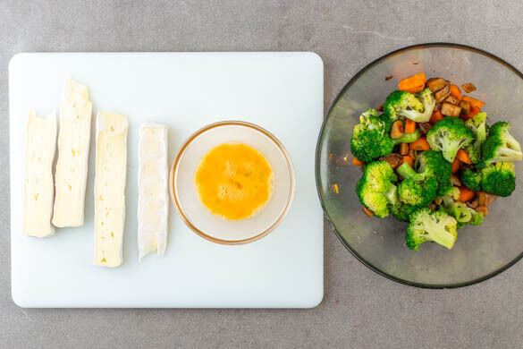 Den Brokkoli und die Karotten mit den Pilzen vermengen, dann 1TL Honig unterrühren und gut mit Pfeffer würzen. Das Gemüse im Gefrierschrank 10–15Min. abkühlen lassen, bis es kalt genug ist, um es zu handhaben. Inzwischen den Käse in 4 Streifen schneiden. 1 Ei mit einer Gabel verquirlen.