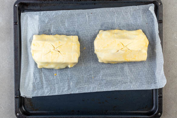 In die Mitte der Pasteten mit einem scharfen Messer jeweils ein Kreuz einritzen und die Pasteten mit dem Ei bestreichen, dann im Ofen in 20–25Min. goldbraun backen. Vor dem Servieren ca. 10Min. abkühlen lassen.