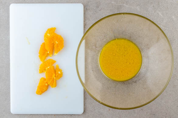 Die Orange halbieren, eine Hälfte auspressen, die andere Hälfte schälen und in Spalten schneiden. 1½EL Orangensaft, 1EL Olivenöl, 1TL Essig, 1TL Honig und ½TL Senf zu einem Dressing verrühren. Probieren und ggf. mit Salz und Pfeffer würzen. Den Feldsalat mit dem Dressing vermengen und mit den Orangenspalten garnieren. Die Pasteten mit dem Salat servieren.
