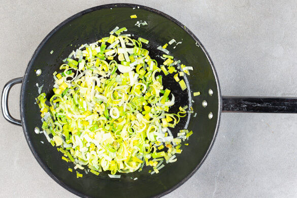 Den Lauch und den Knoblauch in einer mittelgroßen Pfanne mit 2EL Butter und 1 kräftigen Prise Salz bei mittlerer Hitze 3–4Min. anbraten, bis der Lauch weich ist, dann die Pfanne vom Herd nehmen.