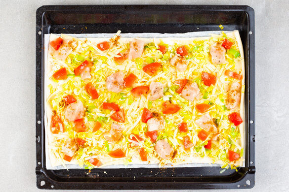 Den Gouda auf den Teig streuen und den Lauch, das Fleisch und die Tomaten darauf verteilen. Mit der ½ der Gewürzmischung sowie 1 Prise Pfeffer würzen und 15–17Min. im Ofen backen, bis der Teig leicht knusprig und der Käse goldgelb ist.