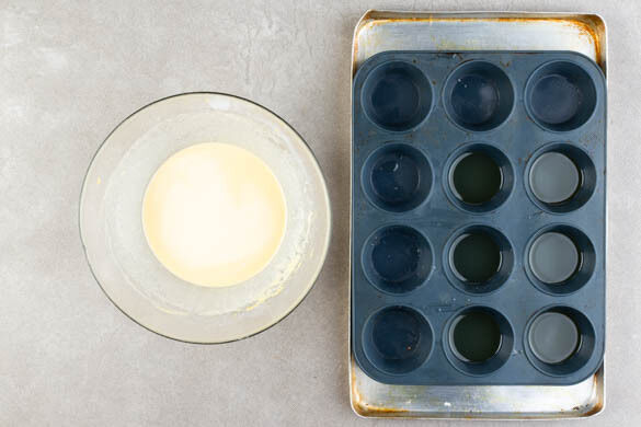Den Backofen auf 240°C (220°C Umluft) vorheizen. Eine Muffin-Backform auf einem Backblech platzieren und 6 Mulden der Backform mit je 1TL Pflanzenöl befüllen. Die Muffin-Backform auf dem Blech in den Ofen geben, während der Ofen vorheizt. Die Eier verquirlen und mit 75g Mehl und 1 kräftigen Prise Salz vermischen, nach und nach 100ml Milch zugeben und den Teig glatt rühren.