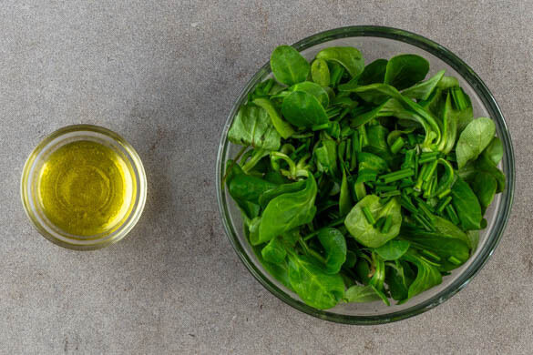 2EL Olivenöl, 2EL Essig und 1EL Wasser verrühren und das Dressing mit Salz und Pfeffer abschmecken. Den Schnittlauch in kleine Röllchen schneiden. Den Feldsalat und die ½ des Schnittlauchs kurz vor dem Servieren mit dem Dressing vermengen. Die Quiche mit dem restlichen Schnittlauch garnieren und mit dem Salat servieren.