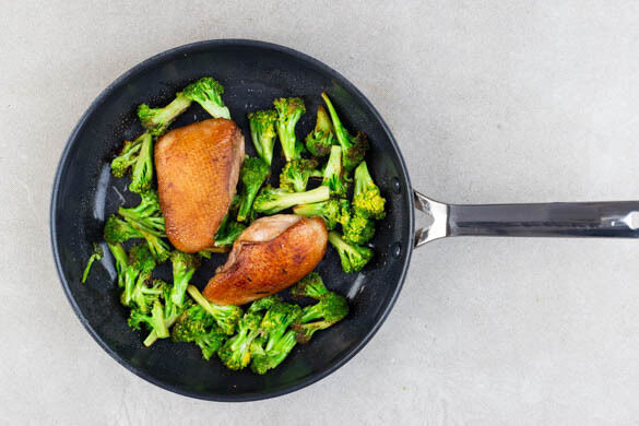 Das Fleisch trocken tupfen und auf der Hautseite in einer großen Pfanne mit 2TL Pflanzenöl bei mittlerer Hitze 10–11Min. braten, bis mindestens die Hälfte des Fetts ausgetreten ist. Das Fleisch wenden, den Brokkoli zufügen und alles abgedeckt 7–8Min. weiterbraten.