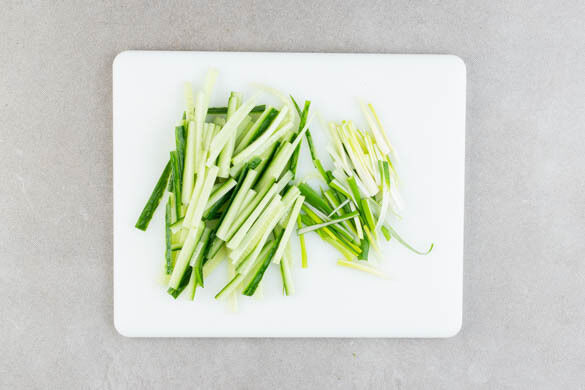 Die Gurke in dünne Stifte schneiden. Die Lauchzwiebeln quer dritteln, die einzelnen Segmente jeweils vierteln.