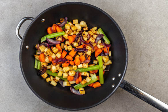 Den Sellerie, die Karotten und die Zwiebelspalten in einer großen Pfanne mit 1EL Olivenöl bei mittlerer Hitze 12–15Min. braten. Zwischendurch mit 1–2EL Wasser ablöschen und verdampfen lassen, bis das Gemüse deutliche Röstspuren hat und bissfest gegart ist. Mit Salz und Pfeffer abschmecken.