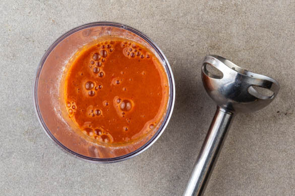 Inzwischen die Limetten halbieren und auspressen. Die Tomaten vierteln und mit der Sweet-Chili-Sauce, der Sojasauce, der ½ des Limettensaftes, 1EL Mehl und 1 Prise Pfeffer in einem hohen Gefäß glatt pürieren. Mit Salz und Pfeffer abschmecken.