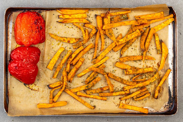 Das Backblech aus dem Ofen nehmen und die Süßkartoffeln und die Paprika mit der Gewürzmischung vermengen.