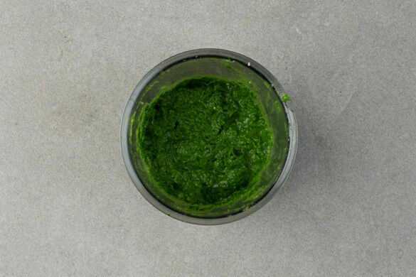 Den Käse fein reiben. Die Petersilie samt Stängeln grob hacken. Den Spinat mit dem Käse, ca. ¾ der Petersilie, 2EL Olivenöl, 1EL Essig, 6–8EL Wasser und 1TL Salz in einem hohen Gefäß zu einem glatten Pesto pürieren. Mit Salz und Pfeffer abschmecken.