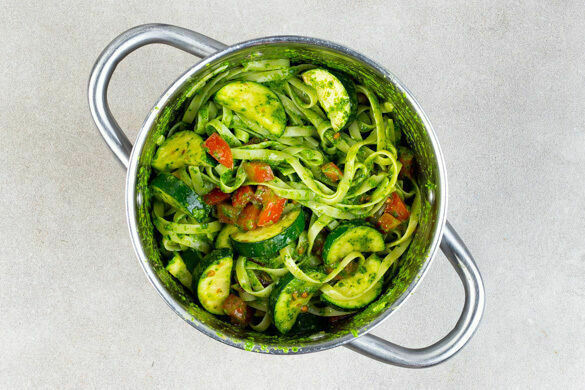 Fleischliebhaber aufgepasst: Das zarte Bio-Hähnchenfleisch wird mit Speck ummantelt im Ofen gegart – da läuft einem das Wasser schon beim Kochen im Munde zusammen. Dazu gibt es feine Pasta mit einem würzigen Spinat-Petersilien-Pesto, natürlich mit Käse, das mit frischen Tomatenwürfeln und gebackener Zucchini das Pastaglück vervollständigt. Lasst es euch schmecken!