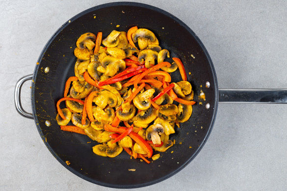 Die Paprika vierteln, entkernen und in dünne Streifen schneiden. Die Pilze ggf. säubern und in dünne Scheiben schneiden. Den Knoblauch in einer großen Pfanne mit 1EL Pflanzenöl bei mittlerer Hitze ca. 30Sek. anbraten. Die Paprika, die Pilze und das Currypulver dazugeben und 2–3Min. braten. Mit Salz und Pfeffer abschmecken.