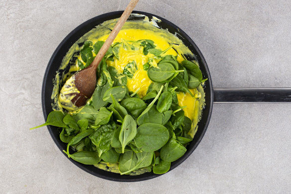 Das Fleisch in einer zweiten mittelgroßen Pfanne mit 1EL Olivenöl bei starker Hitze ca. 2Min. rundum scharf anbraten. Die Tomaten hinzugeben und 1–2Min. mitbraten. Mit Salz und Pfeffer würzen.