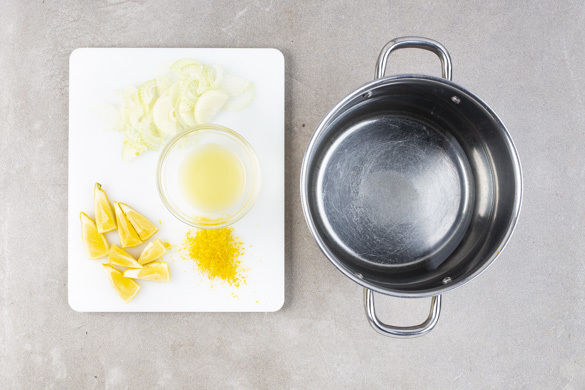 In einem mittelgroßen Topf ausreichend gesalzenes Wasser für die Pasta zum Kochen bringen. Die Zwiebel schälen, halbieren und in feine Streifen schneiden. Die Zitrone fein abreiben und die Zitrone halbieren, eine Hälfte auspressen, die andere Hälfte in Spalten schneiden.