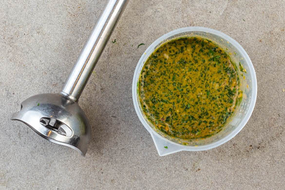 Das Zitronengras von den äußeren harten Blättern befreien, dann den hellen Teil in dünne Scheiben schneiden. Tipp: Das übrige Zitronengras z. B. für einen Tee verwenden. Die Knoblauchzehen schälen und halbieren. Den Koriander grob schneiden. Die Sojasauce, das Zitronengras, die ½ des Knoblauchs, die ½ des Korianders, ½TL Zucker und 1EL Pflanzenöl pürieren.