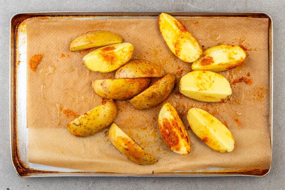 Den Backofen auf 240°C (220°C Umluft) vorheizen. Die Kartoffeln je nach Größe halbieren oder vierteln, auf einem mit Backpapier ausgelegten Backblech mit 2EL Olivenöl, ½TL Salz und 1 kräftigen Prise Pfeffer vermengen und ca. 12Min. im Ofen backen. Dann die Kartoffeln mit der ½ der Gewürzmischung vermengen und weitere 10–15Min. backen, bis sie goldbraun und gar sind.