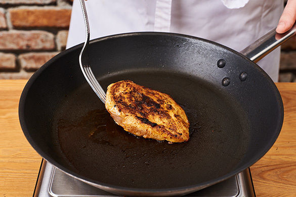 Das Fleisch trocken tupfen und mit dem Gulaschgewürz sowie je 1 kräftigen Prise Salz und Pfeffer einreiben. In der Pfanne mit 2EL Olivenöl bei mittlerer Hitze 4–5Min. von einer Seite anbraten, dann wenden und weitere 3–4Min. braten, bis das Fleisch durch ist. Vom Herd nehmen und ruhen lassen.