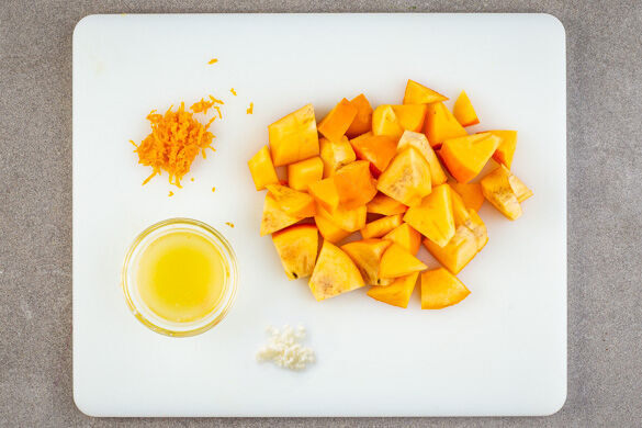 Die Schale von 1 Orange fein abreiben, dann die Orangen halbieren und auspressen. Den Knoblauch schälen und grob würfeln. Die Kaki halbieren und ebenfalls in grobe Würfel schneiden.