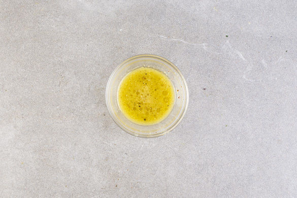 3EL körnigen Senf mit je 4EL Olivenöl, Essig und Wasser sowie je 1 kräftigen Prise Salz, Pfeffer und Zucker zu einem Dressing verrühren. Den Romanasalat quer in dünne Streifen schneiden.