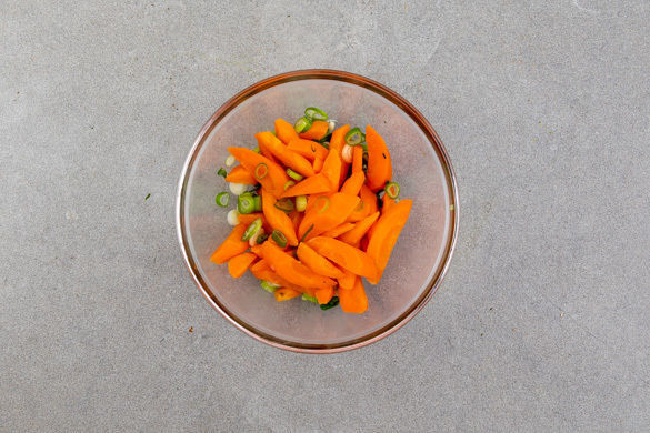 Die Karotten in einem mittelgroßen Topf mit Wasser bedecken und leicht salzen. Die Karotten einmal aufkochen und in 2–3Min. bissfest kochen, dann in ein Sieb abgießen. Die Lauchzwiebeln untermischen und mit Salz und 1 Prise Zucker würzen.