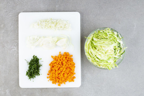 Den Wirsing halbieren, vom Strunk befreien und in feine Streifen schneiden. Die Zwiebeln schälen und halbieren, drei Hälften in feine Würfel, die übrigen Hälften in feine Streifen schneiden. Die Karotten schälen und in ca. 0,5cm kleine Würfel schneiden. Die Petersilie samt Stängeln fein hacken.